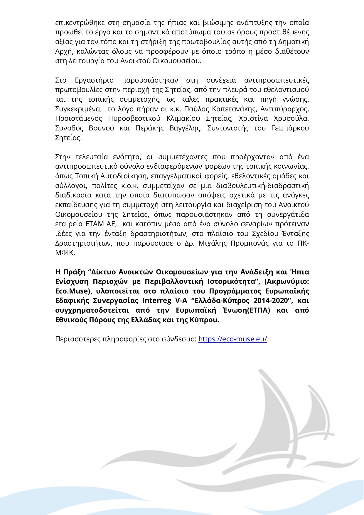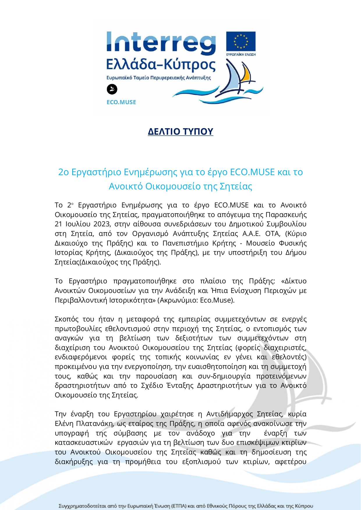Το 2 ο Εργαστήριο Eνημέρωσης για το έργο ECO.MUSE και το Ανοικτό Οικομουσείο της Σητείας, πραγματοποιήθηκε το απόγευμα της Παρασκευής 21 Ιουλίου 2023, στην αίθουσα συνεδριάσεων του Δημοτικού Συμβουλίου στη Σητεία, από τον Οργανισμό Ανάπτυξης Σητείας Α.Α.Ε. ΟΤΑ, (Κύριο Δικαιούχο της Πράξης) και το Πανεπιστήμιο Κρήτης – Μουσείο Φυσικής Ιστορίας Κρήτης, (Δικαιούχος της Πράξης), με την υποστήριξη του Δήμου Σητείας(Δικαιούχος της Πράξης).