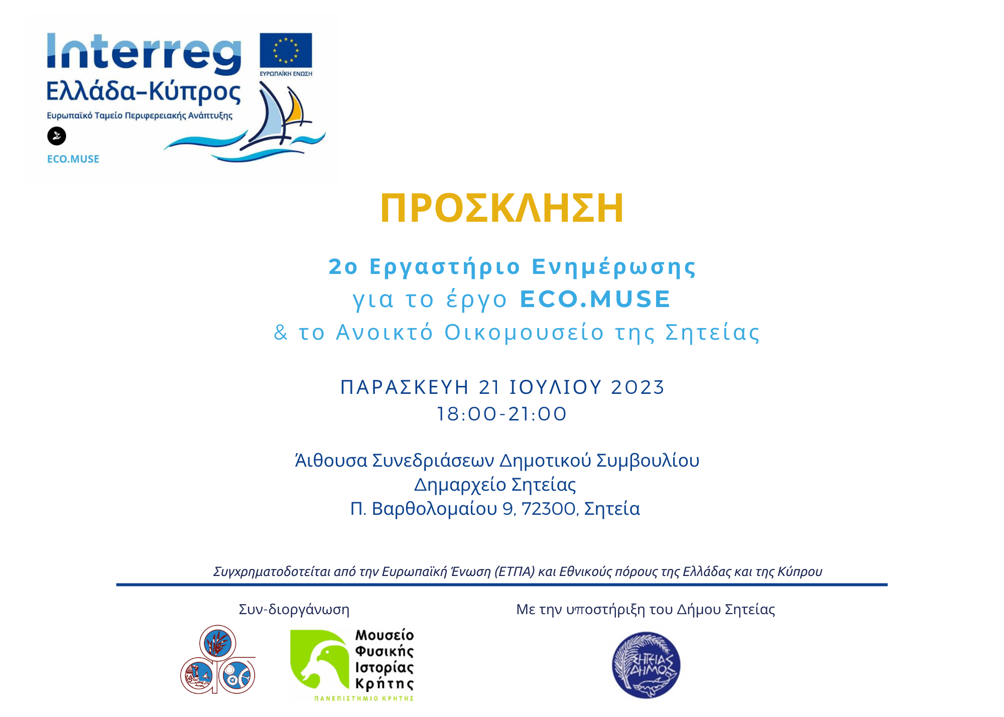 Ο Οργανισμός Ανάπτυξης Σητείας Α.Α.Ε. ΟΤΑ, Κύριος Δικαιούχος (ΚΔ) της Πράξης «Δίκτυο Ανοικτών Οικομουσείων για την Ανάδειξη και Ήπια Ενίσχυση Περιοχών με Περιβαλλοντική Ιστορικότητα» (Ακρωνύμιο: Eco.Muse), και το Πανεπιστήμιο Κρήτης-Μουσείο Φυσικής Ιστορίας Κρήτης (Δικαιούχος 3), με την υποστήριξη του Δήμου Σητείας (Δικαιούχος 2), σας προσκαλούν στο δεύτερο Εργαστήριο Ενημέρωσης για το έργο Eco.Muse, που διοργανώνεται στο Δημαρχείο της Σητείας, την Παρασκευή 21 Ιουλίου 2023, και ώρα 18:00-21:00, στην Αίθουσα Συνεδριάσεων του Δημοτικού Συμβουλίου.