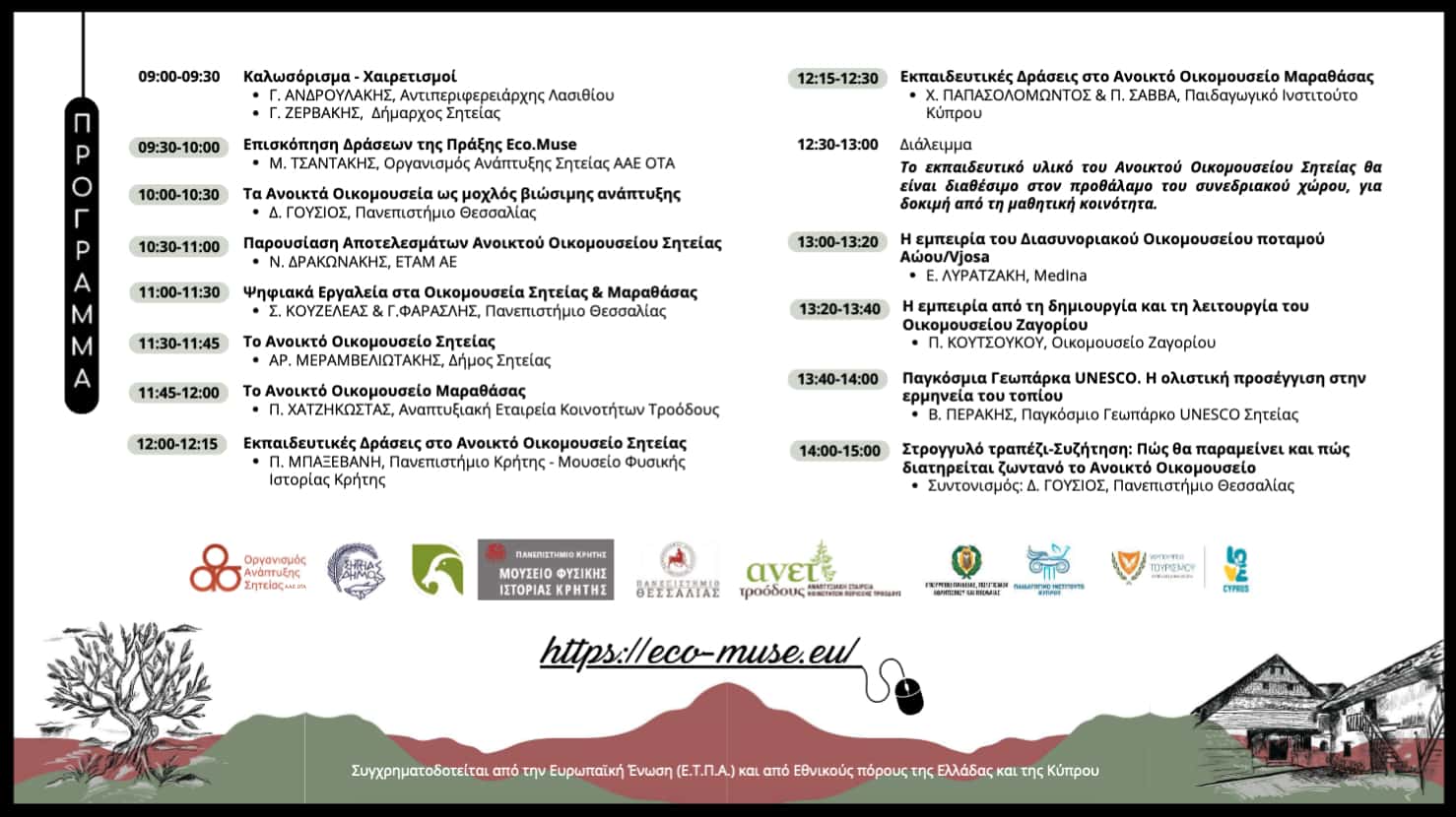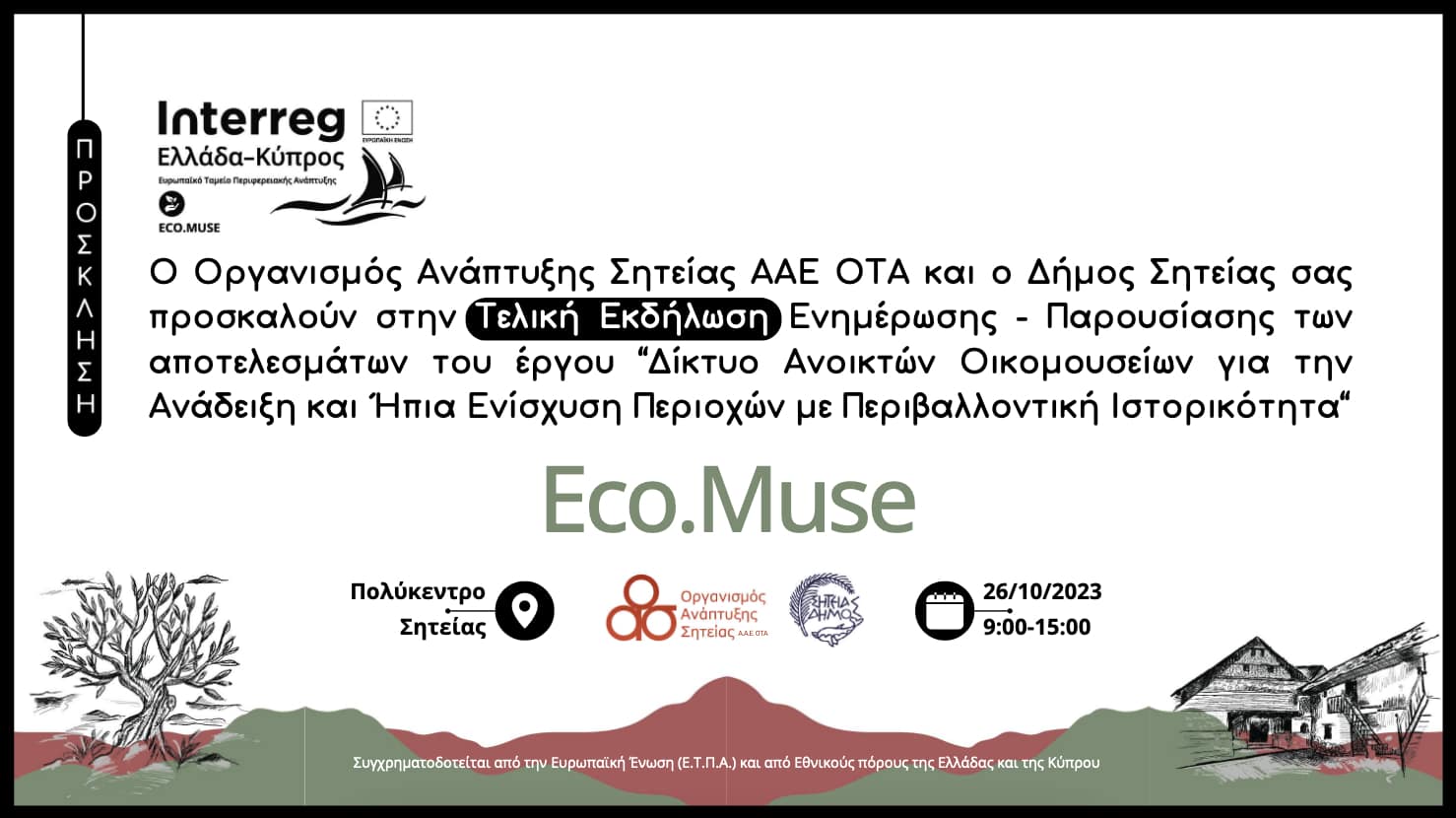 Ο Οργανισμός Ανάπτυξης Σητείας (ΟΑΣ ΑΑΕ ΟΤΑ), Κύριος Δικαιούχος (ΚΔ) της Πράξης “Δίκτυο Ανοικτών Οικομουσείων για την Ανάδειξη και Ήπια Ενίσχυση Περιοχών με Περιβαλλοντική Ιστορικότητα, με ακρωνύμιο Eco.Muse”, και Δήμος Σητείας, Δικαιούχος (Δ2), σας προσκαλούν στις δραστηριότητες κλεισίματος της Πράξης, στη Σητεία, ήτοι Τελική Εκδήλωση Ενημέρωσης, Παρουσίασης και Διάχυσης Αποτελεσμάτων της Πράξης Eco.Muse, που διοργανώνεται στο Πολύκεντρο Σητείας, την Πέμπτη, 26 Οκτωβρίου 2023, και ώρες 09:00-16:30.